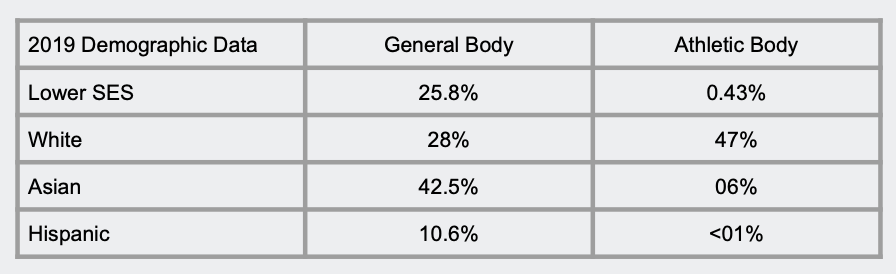 Most athletes in the NCAA are white, and this number increases at private elite institutions, such as those in the NESCAC (Middlebury, Williams, Amherst, etc.). Even more athletes in the NCAA, regardless of race, are from higher socioeconomic backgrounds.